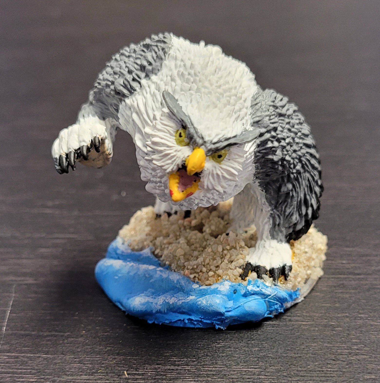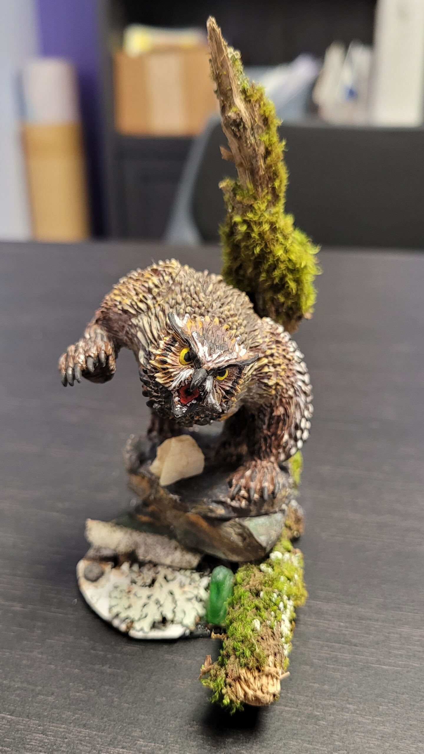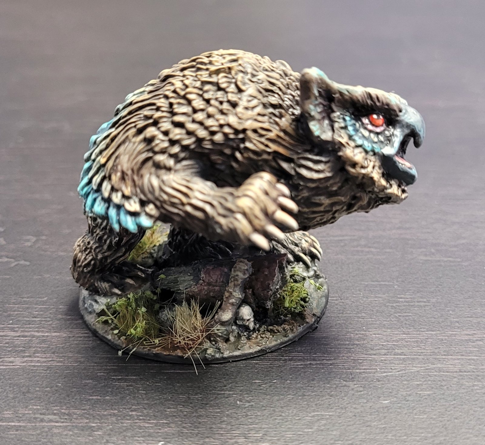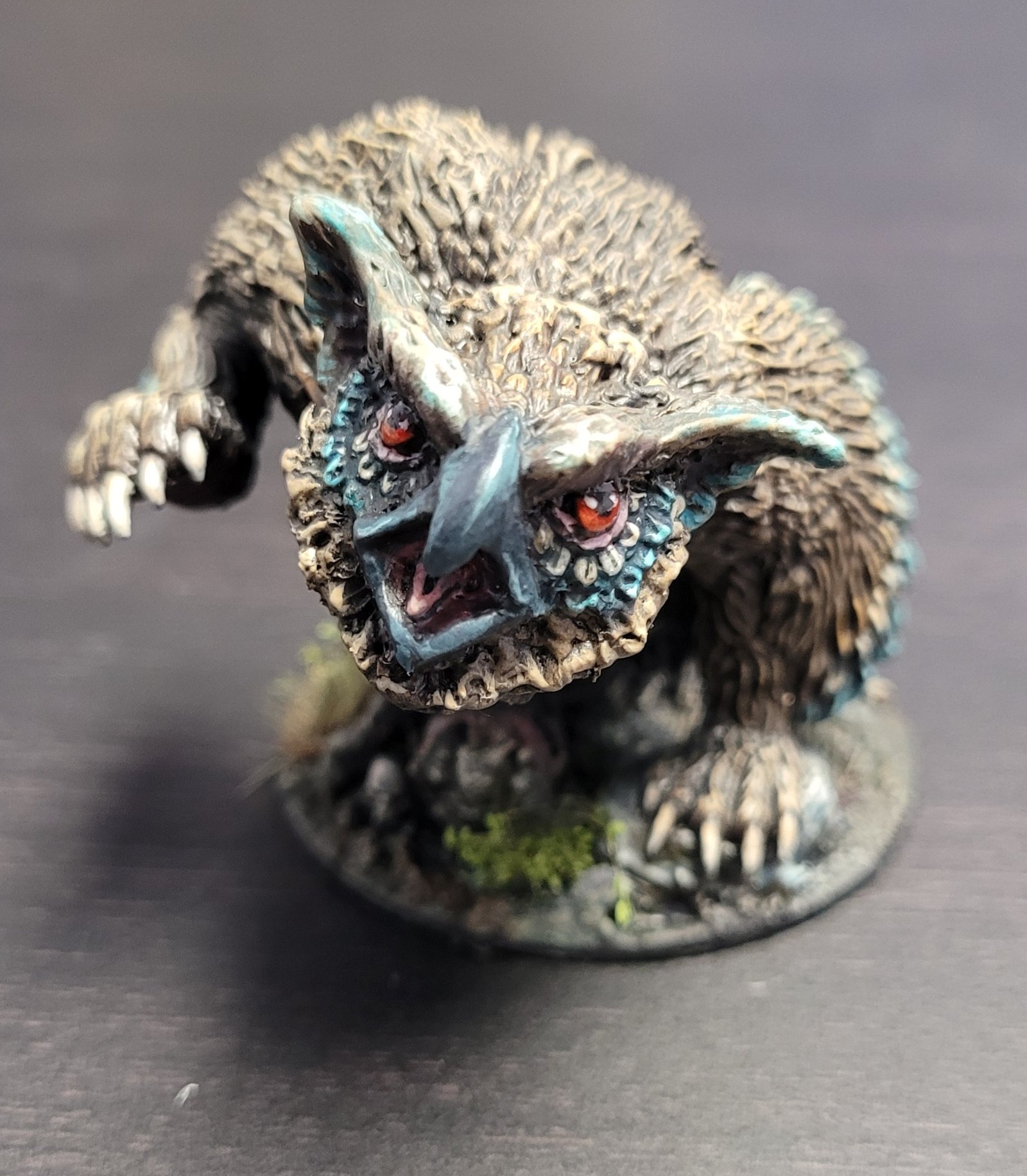 Excellent work, Nicole! We love how detailed and lifelike the face is painted on your Owlbear. We also enjoy the unique feather-coloring and blending of paint. The eyes seem very alive and fierce!